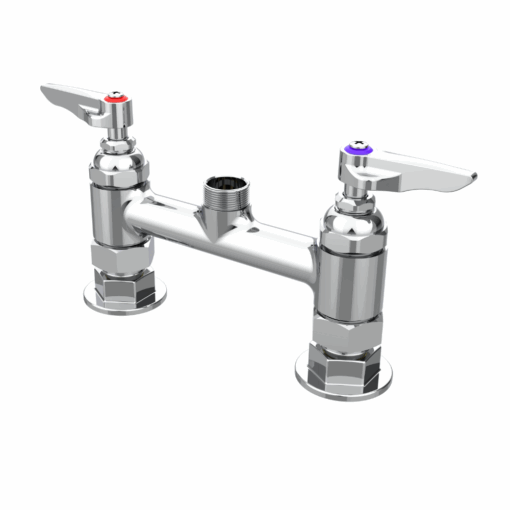 Its user-friendly lever handles, equipped with hot and cold indexes, ensure smooth operation, while compression cartridges with spring checks provide consistent performance and backflow protection.