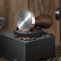 Espresso tampers are an important tool for the barista, used to evenly press down finely ground coffee before pressurized water is applied. This espresso tamper features a wooden teak handle with a high-quality stainless steel base.